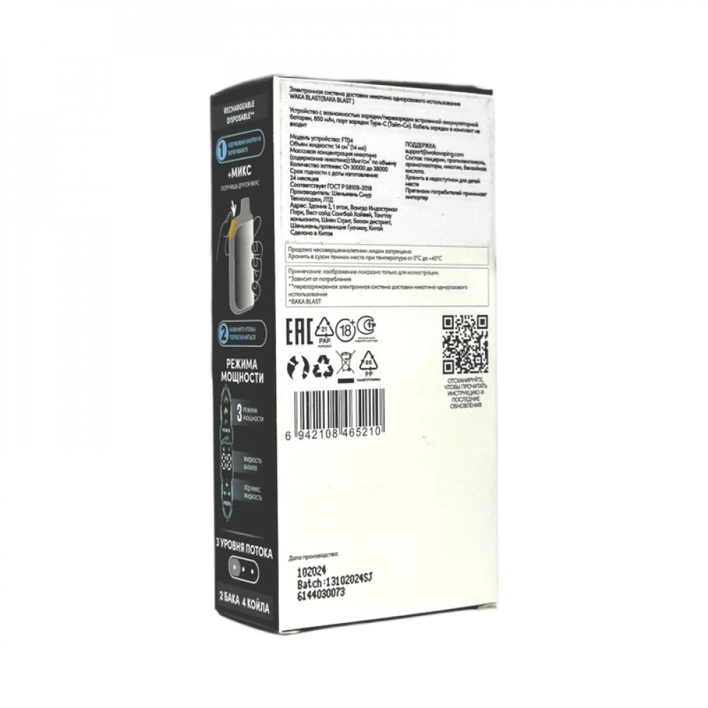 Технические характеристики WAKA BLAST 38000 Hard - Манго + ваниль микс
